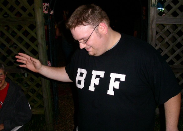 to the left in her Boo T-shirt, delightfully entertained by Eric's